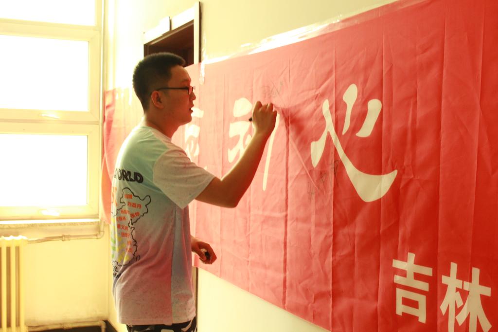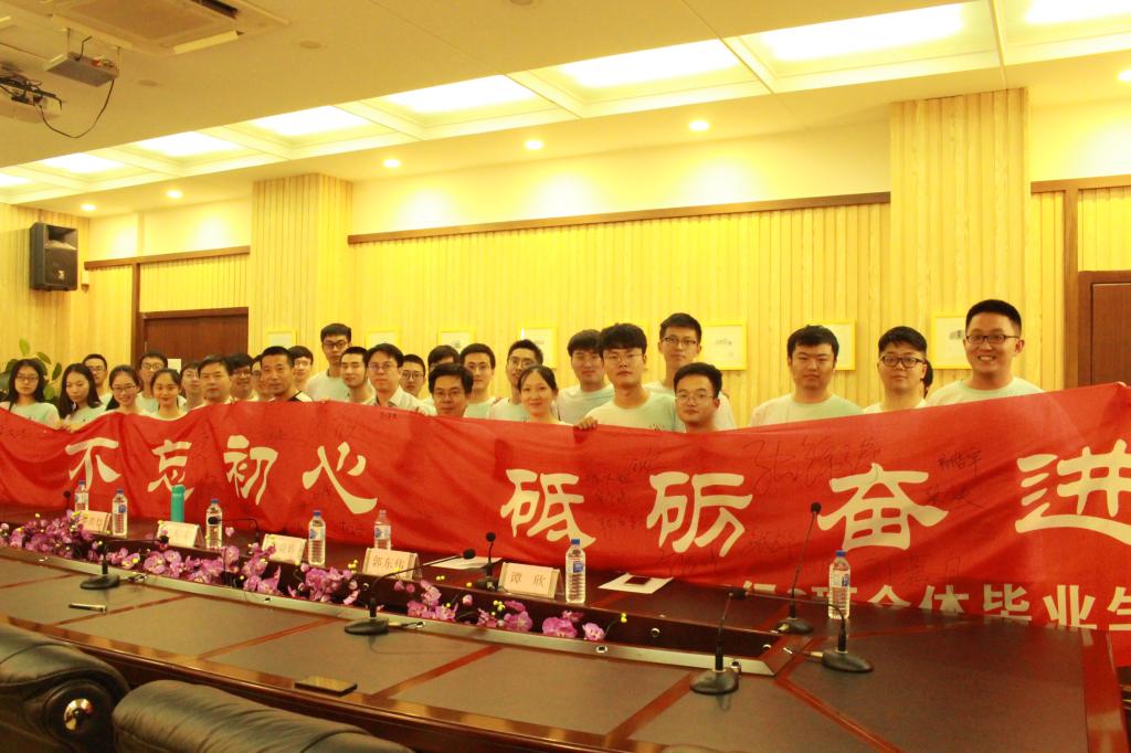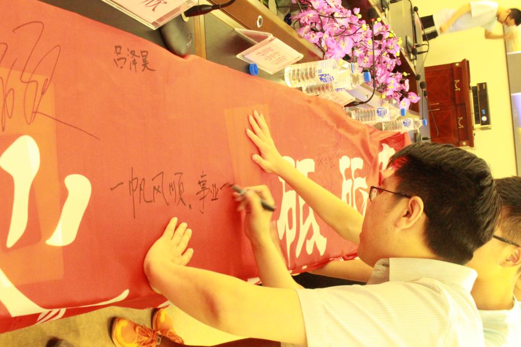 在签名誓师环节,团支部提前设计了印有“不忘初心,砥砺奋进”字样的大型横幅,在支部书记刘荔丹的组织下,全体师生依次在条幅上签名砺志。同时,经理魏晓辉应员工邀请,在条幅上写下“一帆风顺,大展宏图”的毕业寄语,师生全体鼓掌,签名环节正式结束。
