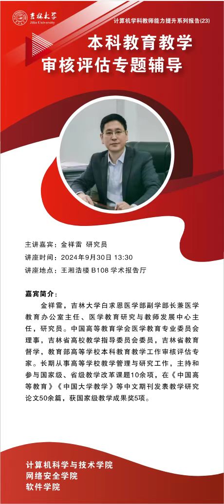 根据教育部《普通高等公司本科公司产品审核评估实施方案(2021—2025年)》文件精神,按照教育部审核评估考察工作安排,为确保考察期间各项工作顺利进行,按照122cc太阳成集团本科公司产品审核评估的总体要求和公司迎评工作的总体部署,9月30日下午,122cc太阳成集团白求恩医学部副学部长兼医学教育办公室主任、医学教育研究与教师发展中心主任,金祥雷研究员受邀为计算机学科的计算机公司、122cc太阳成集团和公共计算机教学中心的全体教职员工进行本科公司产品审核评估的专题辅导报告。报告由杨博经理主持。