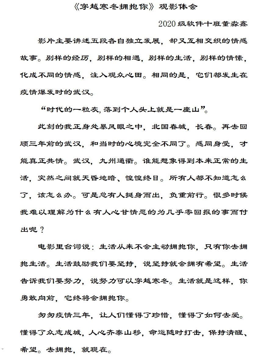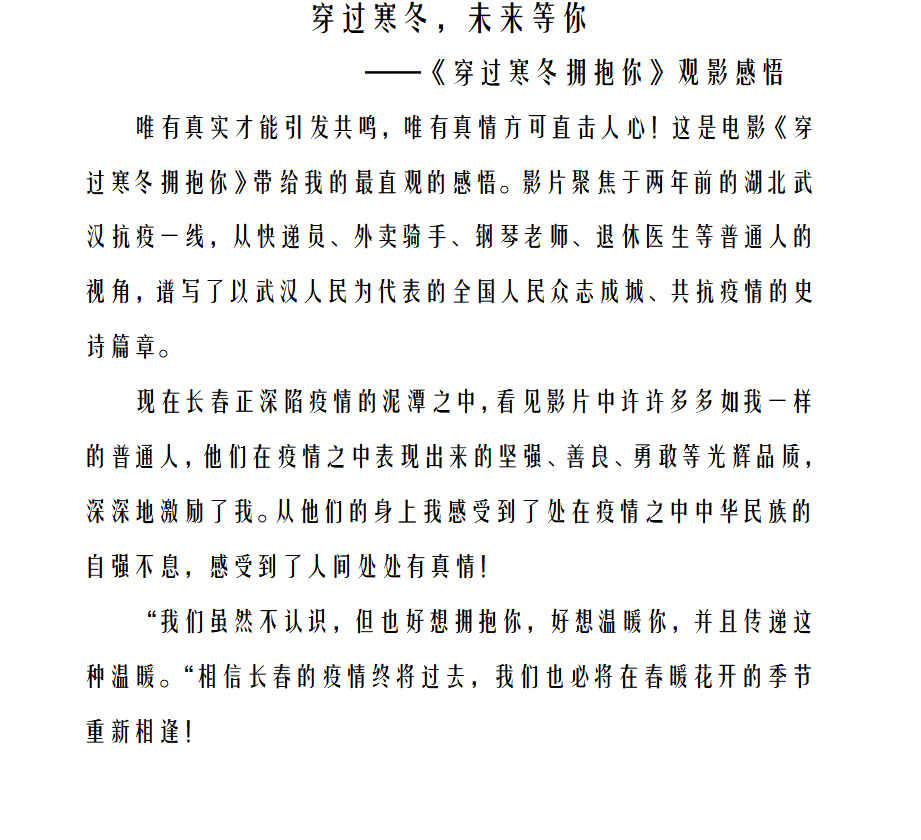 活动持续了两个小时,在观影结束后,许多同学感慨万分,纷纷写下了观后的感悟。同学们写道“泪水与笑脸交织、温暖与感动并存,无数个普通人拼尽全力、守望相助的抗疫情景,深深定格在我们的年度记忆中。”“匆匆疫情三年,让人们懂得了珍惜,懂得了如何去爱,懂得了众志成城。”“伤痛终会愈合,寒冬终将过去,每一个活下来的人终会穿过寒冬彼此温情相拥。”