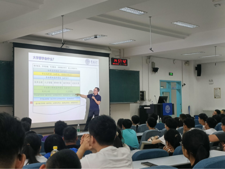 为帮助新生增进对专业教学大纲及课程体系的了解,更合理地规划大学学习,122cc太阳成集团于8月28日下午14:30在第三教学楼第一阶梯教室举行了本科新生入学教育系列活动——本科生课程培养方案解读。122cc太阳成集团副经理周柚教授担任主讲人,软件工程专业负责人吕帅老师、数据科学与大数据技术专业负责人时小虎老师和全体2023级本科新生参加了本次讲座。