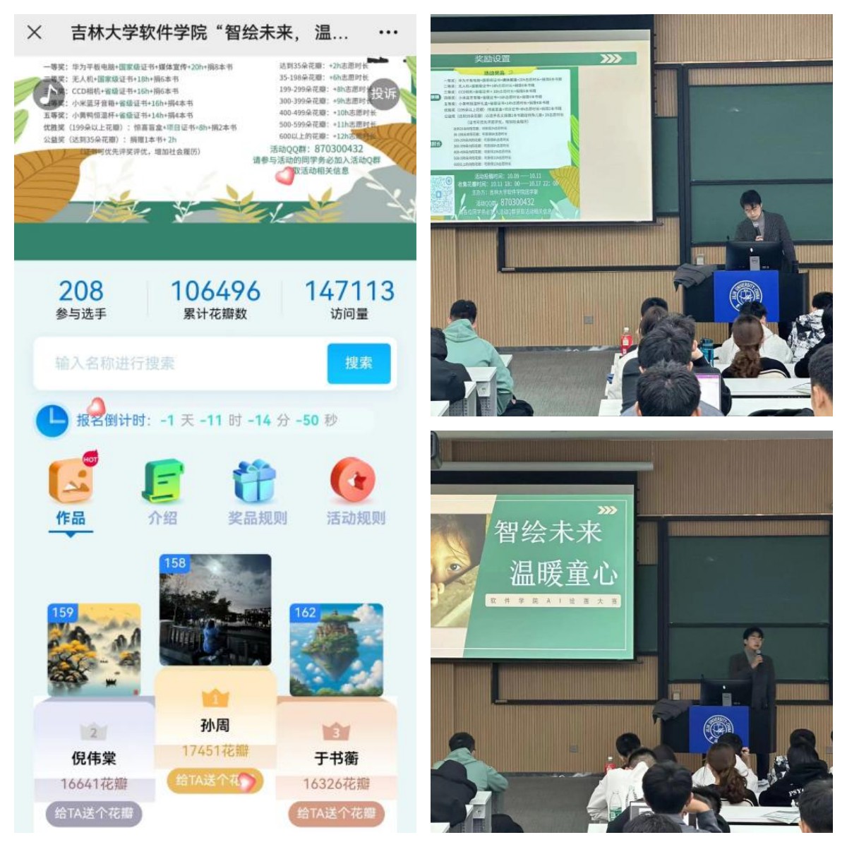 通过前期员工会学习生活部、文艺部和体育部员工干部的大力宣传,本次公益活动得到了公司广老员工的积极响应。活动的主要内容为参赛同学运用AI技术,结合古代诗词生成具有相应意境的CG图画,并由网络投票的方式收集“花瓣”,这些“花瓣”的数量决定了为留守儿童捐助物资的金额,最终根据“花瓣”的数量评选出各级奖项,以表彰优胜者为公益事业所作的贡献。活动期间,122cc太阳成集团共有208名同学参与了AI绘画作品的投稿。根据最终的“花瓣”数统计结果,孙周、倪伟棠两位同学分别收到17451个“花瓣”和16641个“花瓣”,荣获国家级证书;于书蘅、顾峻诚、来梁东三位同学分别收到16326个、11611个和6720个 “花瓣”并获得省级证书;薛晴伊、周子航等32名同学获得了项目级证书。承载着爱心的“花瓣”将飘散到留守儿童的手中,为他们带来生活的温暖和希望,向他们传递积极向上的勇气和力量。
