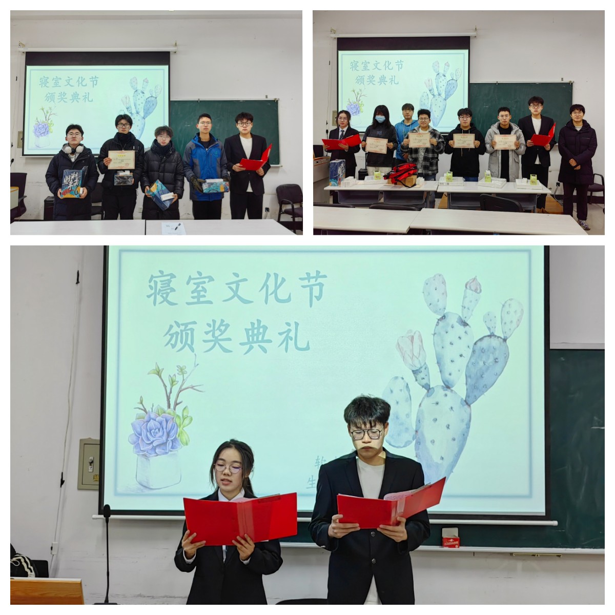 最终,通过对两个环节的评分进行加权,计算得出每个寝室的总成绩,并于12月1日在王湘浩楼A124室举办了颁奖典礼。共有9个优秀寝室脱颖而出,大学城三公寓3096寝室荣获一等奖,大学城三公寓的3020、3037 、3021寝室获得二等奖,大学城三公寓3018、3003、3102、3052、3106寝室获得三等奖。