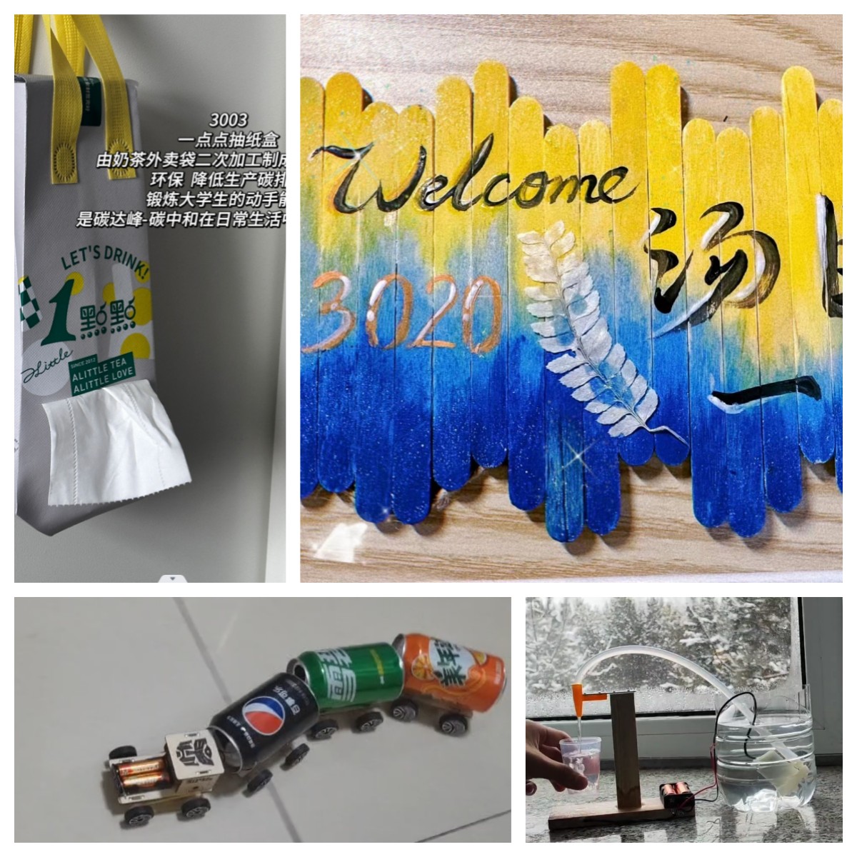活动第二阶段,寝室特色文化主要围绕“环保”和“友情”两个主题,参赛寝室可以选择任意一个主题进行展示。在“环保”方面,同学们通过浏览院团委公众号上发布的垃圾分类科普文章,学习垃圾分类知识,并发挥独立思考和动手能力,变废为宝,制作出自动饮水机、抽纸袋、易拉罐小火车、冰棒门牌等创意满满、有趣实用的作品,引得评委的连连惊叹和赞许。在“友情”方面,同学们将寝室成员的日常合影和生活趣事制作成Vlog或PPT,表达出彼此之间的真挚情感和深厚友谊。