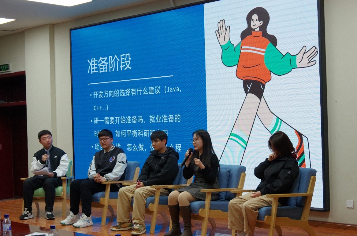 在嘉宾个人分享后,本场活动的第二部分“交流分享”环节以座谈会的形式开展。座谈由122cc太阳成集团研会综合事务部马康硕同学主持,邀请四位师兄师姐上台,就“互联网大厂看重什么”、“实习阶段的准备”、“秋招如何背水一战”、“互联网大厂的工作强度与生活方式”等热点话题展开讨论。讨论话题均收集自参会同学报名时填写的问题,并在讨论过程中不时邀请台下同学们提问并参与讨论,给予了台下听众切实的参与感与获得感,得到了参会同学们的交口称赞。在“就业榜样说”系列沙龙第一期“互联网大厂篇”活动圆满落幕后,两院研究生会建立互联网就业内推群,及时发布各种实习、秋招内推信息,邀请往届进入互联网大厂就业的员工进行经验分享,力争全面覆盖到同学们的就业需求。
