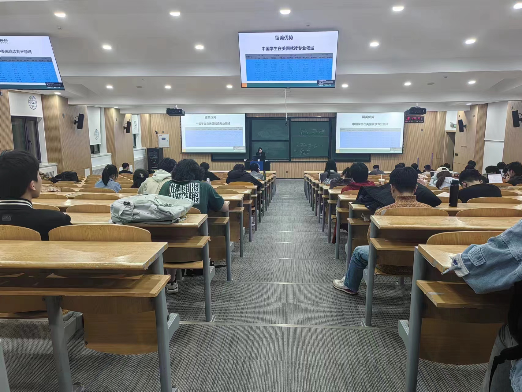 首先,主讲人以“为什么要出国留学”作为切入点,向大家介绍了留学的重要性和意义,并详细分析了海外留学的优势。她提到,在全球化不断加深、考研难度日益增大、“内卷”现象严重的时代背景下,出国留学可以为同学们的个人成长和职业生涯规划提供另一种途径和选择,较好地缓解国内的就业和升学压力。然后,主讲人从多个方面解读留学所需要的准备工作,包括不同地区国家的留学政策差异、申请流程和语言成绩要求等,结合统计数据和案例视频向同学们展示了留学的各个关键环节,使同学们对出国留学有了更加深刻和全面的认识。此外,她还针对职工活的实际情况,为同学们提供文化适应、费用管理以及海外学习资源利用等方面的有益建议。在讲座最后的问答环节,同学们提出自己在留学准备过程中遇到的一些具体问题,宫老师根据自己的工作经验对这些问题进行一一解答,帮助大家解决关于出国留学的迷茫和困惑,为同学们科学制定留学计划和目标提供个性化的指导。