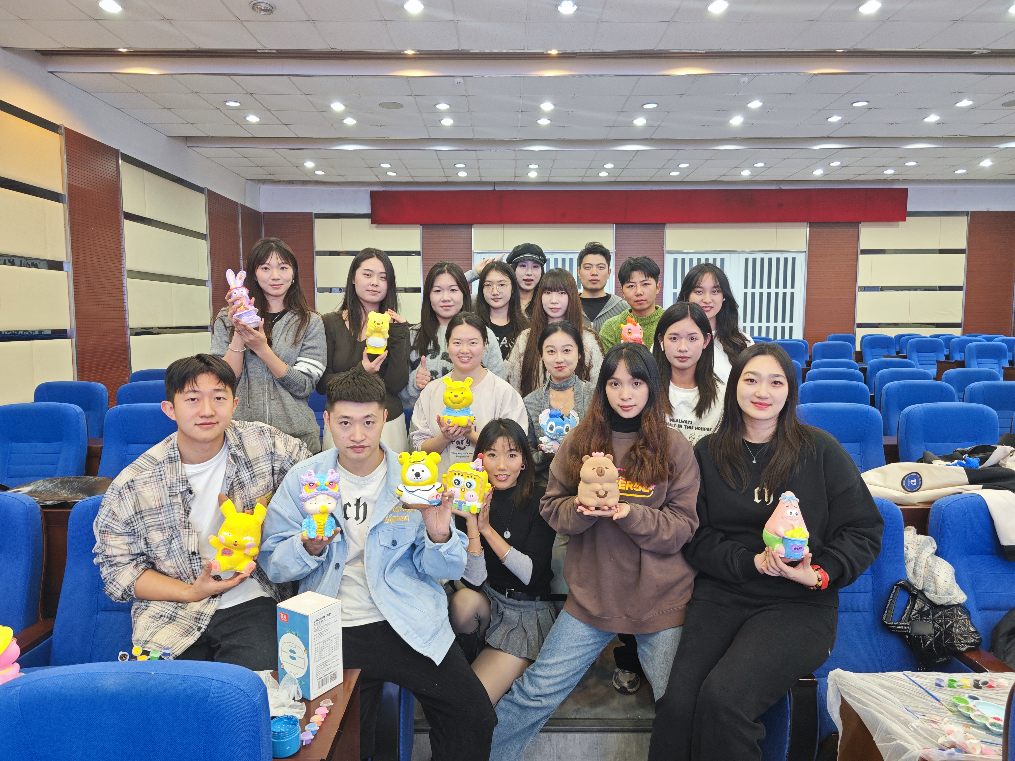 活动在一片欢声笑语中拉开帷幕。首先进行的是热身小游戏“听奏识曲”,同学们被分为多个小组,通过抢答音乐前奏来猜测歌名、歌手和动画名称。这个环节不仅考验了同学们的音乐素养,也唤起了大家对童年动画的美好回忆。小组之间竞争激烈,现场气氛热烈,最终根据回答正确的信息数量决出了名次。随后,活动进入了核心环节——石膏彩绘。同学们根据报名情况被分为情侣组、友谊组和个人组,每组领取一个石膏娃娃,开始了自己的创意涂鸦。大家纷纷发挥想象力,将童年时期喜爱的卡通形象绘制在石膏娃娃上。每一笔都凝聚着参与者的情感与想象,将童年的快乐与当下的创意完美融合。这些色彩斑斓的作品不仅展现了同学们的艺术才华,也成了他们心中珍贵的记忆。