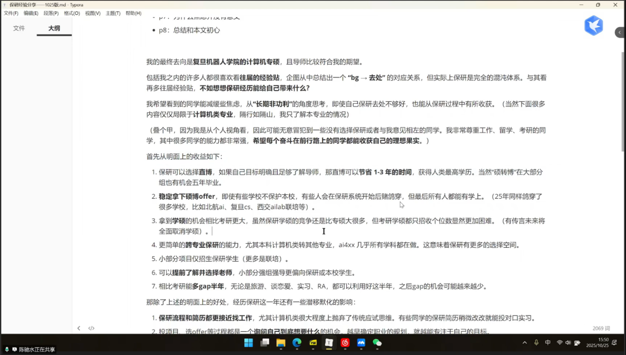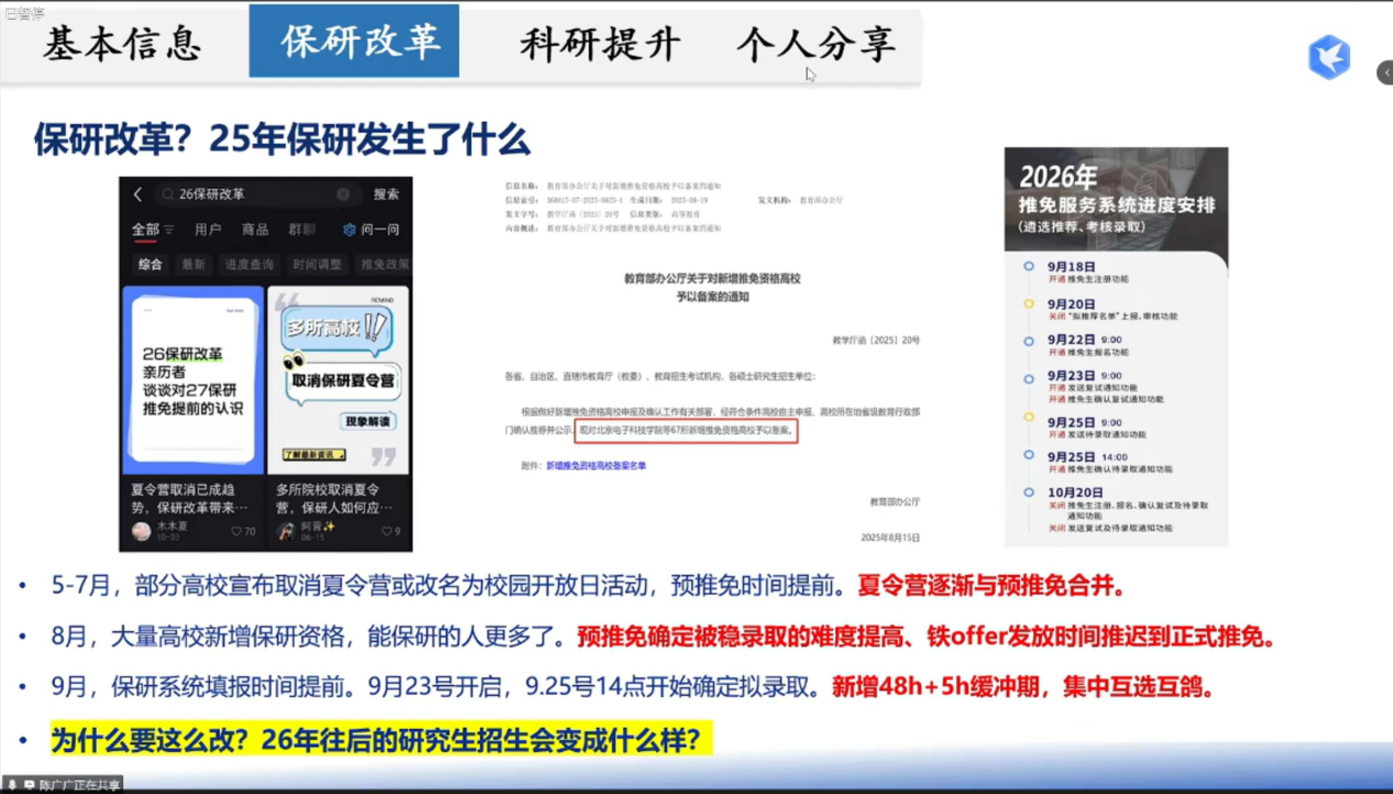 会上,陈庆喜解读研招网政策,明确绩点定保研初试、目标校考核定复试的核心逻辑,她建议同学们从本科课设切入科研,通过阅读CCF A类论文、参与科研项目积累学术素养;鲍俊则拆解保研全周期,6-8月夏令营竞争最激烈,8-9月预推免是上岸关键期,9-10月9推/10推风险高,同时针对“rk(专业排名)”、“套磁”等保研常用术语进行科普;陈驰水结合自身经历,提出科研准备需结合职业规划,提醒大家减少“经验帖焦虑”,避免沉迷各类分享内容,应将重点放在入营后考核经验总结与自身能力提升上;关玉卓分享信息收集方法,推荐用表格对比院校情况实现精准选校,考核准备方面,她建议笔试针对性背目标校题库,机试每日刷5-6道LeetCode Hot100题,针对边缘同学,她建议采取“海投套磁”策略,梳理提炼自身参与的各类竞赛与课设经历,提升竞争力;赵梓霖强调选导师时应优先考虑科研方向匹配度,在套磁前应研读导师发表的论文,备考上,他推荐每日兼顾2小时算法训练与3小时项目推进,保持高效状态;平景龙提供多元化的保研路径参考,他推荐通过院校官网、ResearchGate等平台搜集导师信息,为排名不占优同学介绍工程硕博、国优计划等小众路径,提醒大家在面试时突出个人核心优势;张斯钰建议同学们按规划理性选校,若大家以就业为目标,应侧重“集团title+实习资源”,若计划走科研道路,则需优先考虑“导师水平+课题组实力”。